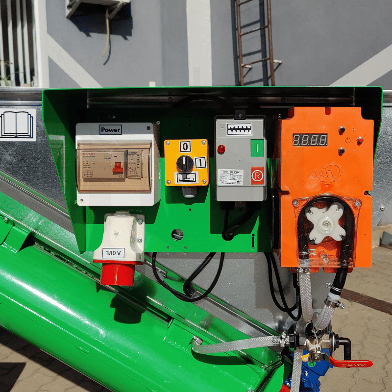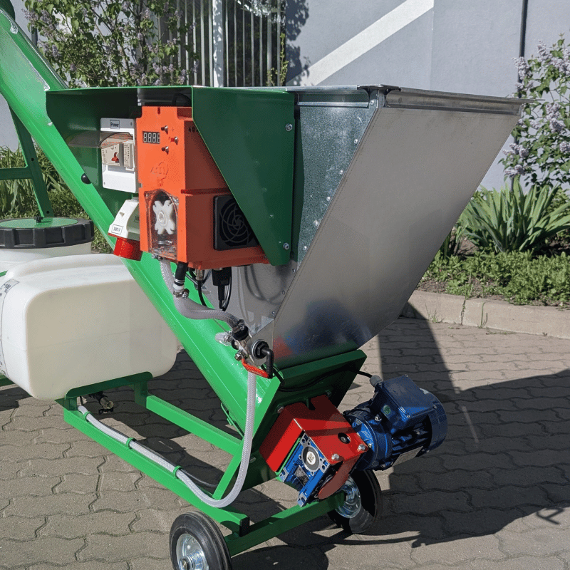Le PNSHF-3-01 BBPP repose sur un système de traitement à vis (auger) associé à une pompe doseuse péristaltique programmable. Les semences sont introduites dans la trémie d’alimentation puis transportées par la vis à palettes équipée de patins en polyuréthane, garantissant un traitement doux et uniforme.